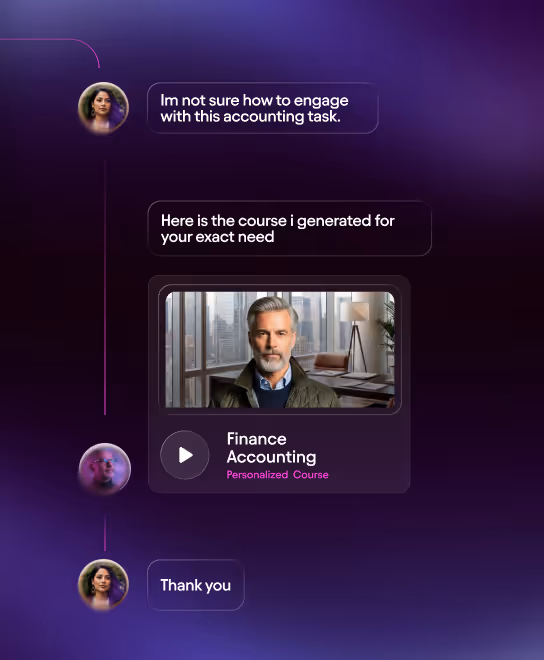Instantly create courses based on your documents. Edit, pick the instructor, and assign. Learners don’t just watch, they can ask questions and interact with the instructor.